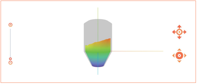 用于顯示罐體模型以及罐體內(nèi)物料表面的三維形態(tài)。在此狀態(tài)下,可通過+/-按鍵進(jìn)行放大縮小操作。罐體三維模塊的右側(cè)按鍵 ,點(diǎn)擊該按鍵