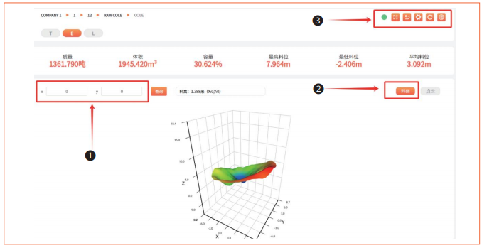標(biāo)號(hào)②:用于切換顯示的三維形態(tài)為點(diǎn)云形式還是料面形式。切換好狀態(tài)下,可通過按住鼠標(biāo)左/右鍵進(jìn)行拖動(dòng)及旋轉(zhuǎn)操作,通過按住鼠標(biāo)中間的滾輪進(jìn)行放大縮小操作。