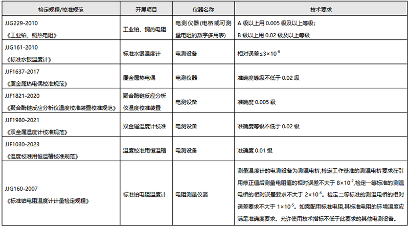 本文以直流電阻信號為例,介紹熱學計量中常見項目電測儀表的基本情況。標準鉑電阻溫度計是-196℃~660℃溫度范圍內常用的標準器具,是開展工業鉑、銅熱電阻溫度計檢定、標準水銀溫度計檢定、溫度變送器校準、精密測溫的主標準器。用標準鉑電阻溫度計作為主標準器開展量值傳遞時,需配接電測設備用于測量其電阻值。常見檢定規程/標準規范中對電測設備的要求如表2所示。