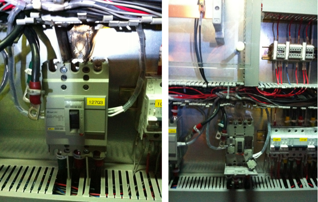 一套線纜生產設備的電氣控制系統(tǒng)在試運行過程中發(fā)生短路跳閘現(xiàn)象,直接造成柜內250A的斷路器跳閘,部分線路燒焦,如圖: