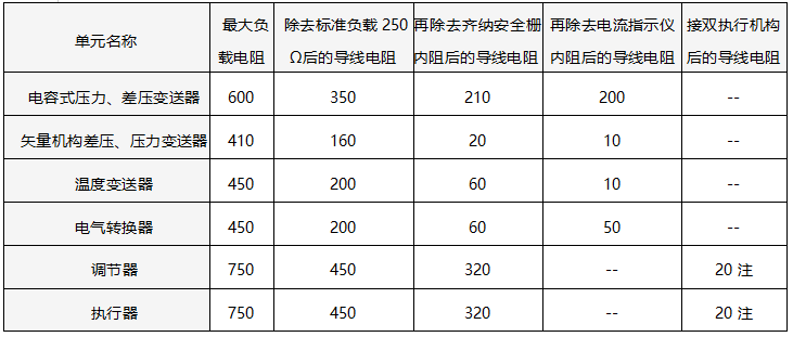 20世紀80年代,上海自動化儀表一廠針對其生產的DDZ-Ⅲ型電動單元組合儀表的變送器、調節器、電氣轉換器、操作器等單元,在最低供電電壓(22.8V)時允許的導線電阻,曾列過一個表格供用戶參考,表后還注明:“如果系統設計時導線電阻不超過上表,則信號電流在4-20mA范圍內,都能保證傳送的精度不變?!庇捎谄溥€有現實意義,特把此表格提供如下: